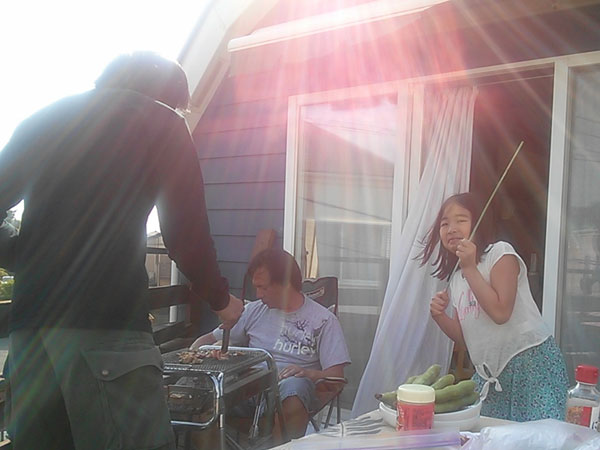 お友達のおうちのウッドデッキで心地いい光と風を浴びながら(正確には強風でした!)おいしいお肉とビール!